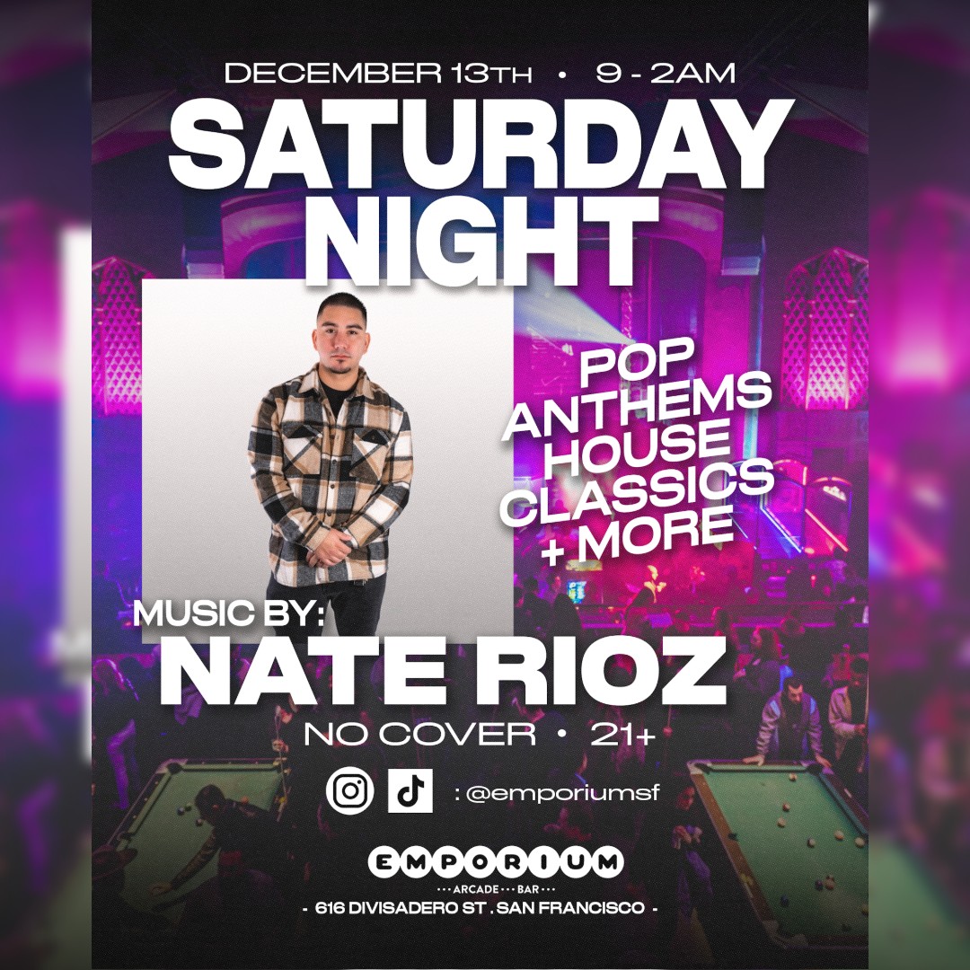 San Francisco 616 Divisadero St, San Francisco, CA, United StatesEmbrace the vibes at Emporium. Catch Nate Rioz dropping beats all night alongside some of the best arcade games and drinks around! No cover charge, 21+